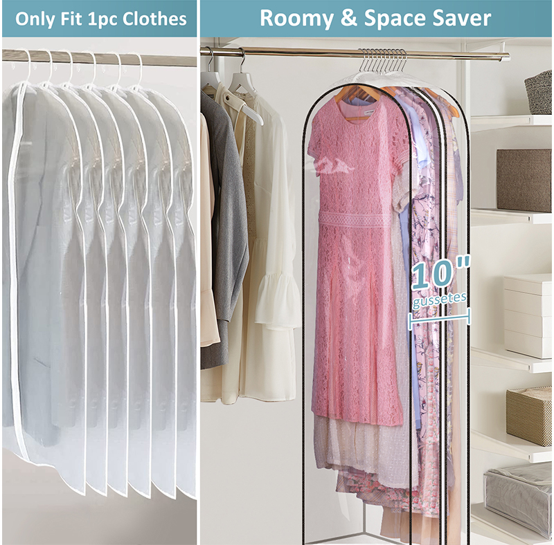 【Upgraded 10" Gussetes & 3 Packs】Size: 60"x 24"x 10". Each garment bags for storage with 10" gusset, much wider than 4'' gusseted garment bags, each pack roomy enough to hold 10 pcs women's dress or 6pcs winter coat of normal thickness, set of 3 packs clear garment bags can store about 25-30pcs long size clothes in total;