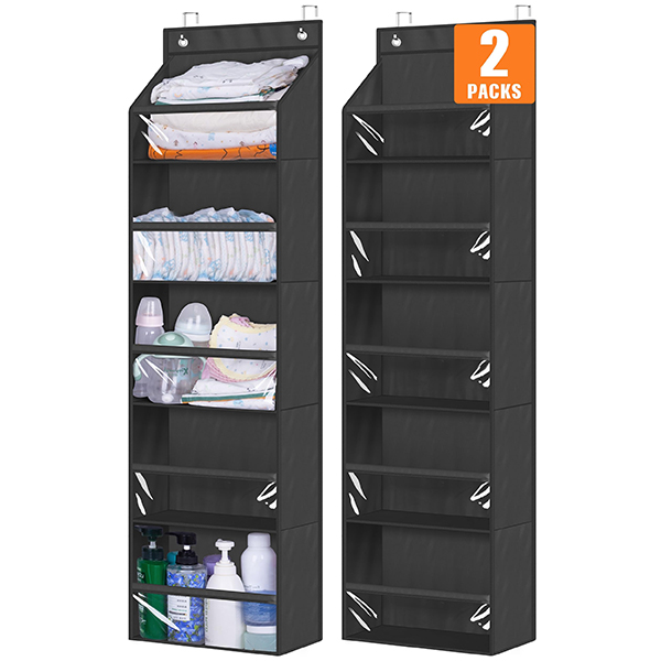 【2 Pack & Large Capacity】: Includes 2 packs of baby storage organizer, suitable for narrow doors, it can hold a total of 200 diapers, 70 nursing bottles, 60 pairs of kids shoes etc. Size of the over the door storage is 12.2"W x 6.5"D x 53.3"H, each pocket measures 12.2"W x 6.5" x 10.6"H.
