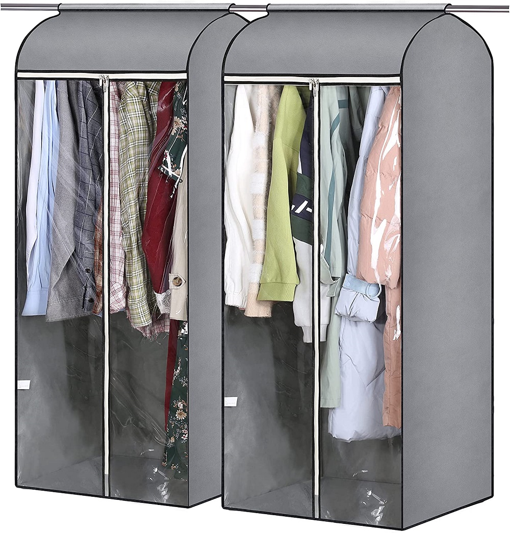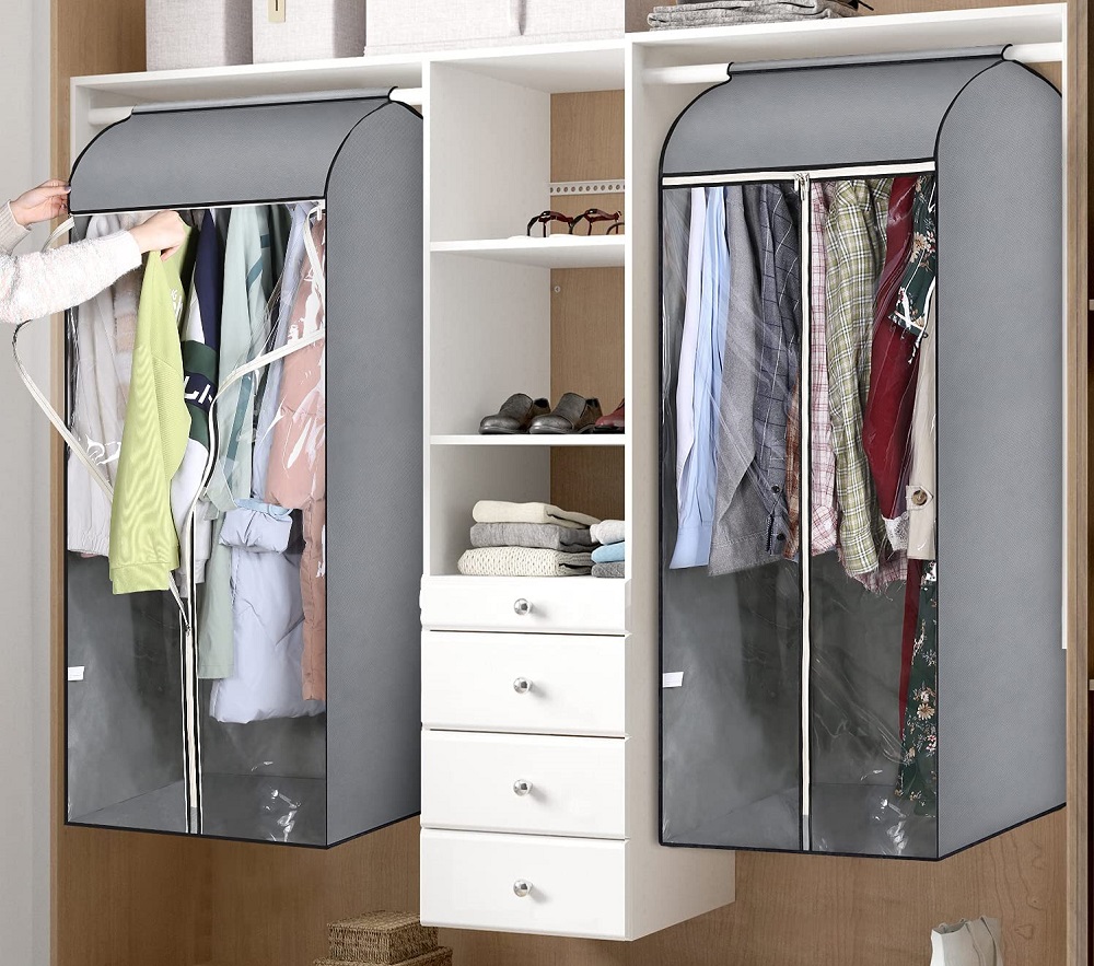 【Visible PVC Window】 hanging clothes storage with front plastic PVC can see which clothes that going to wear without unzipping the coat storage bag hanging, smooth triple 5# zipper start from top to the bottom make clothes easy to take out and hang in;