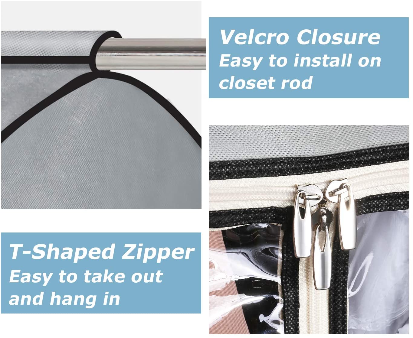 【Completely Sealed】Wide hook and loop fasteners that easy to install in few minutes and no need to remove the wardrobe or rod, suit cover wraps around existing rod and bottom stitching make garment bags for closet storage more dust and damp resistant;