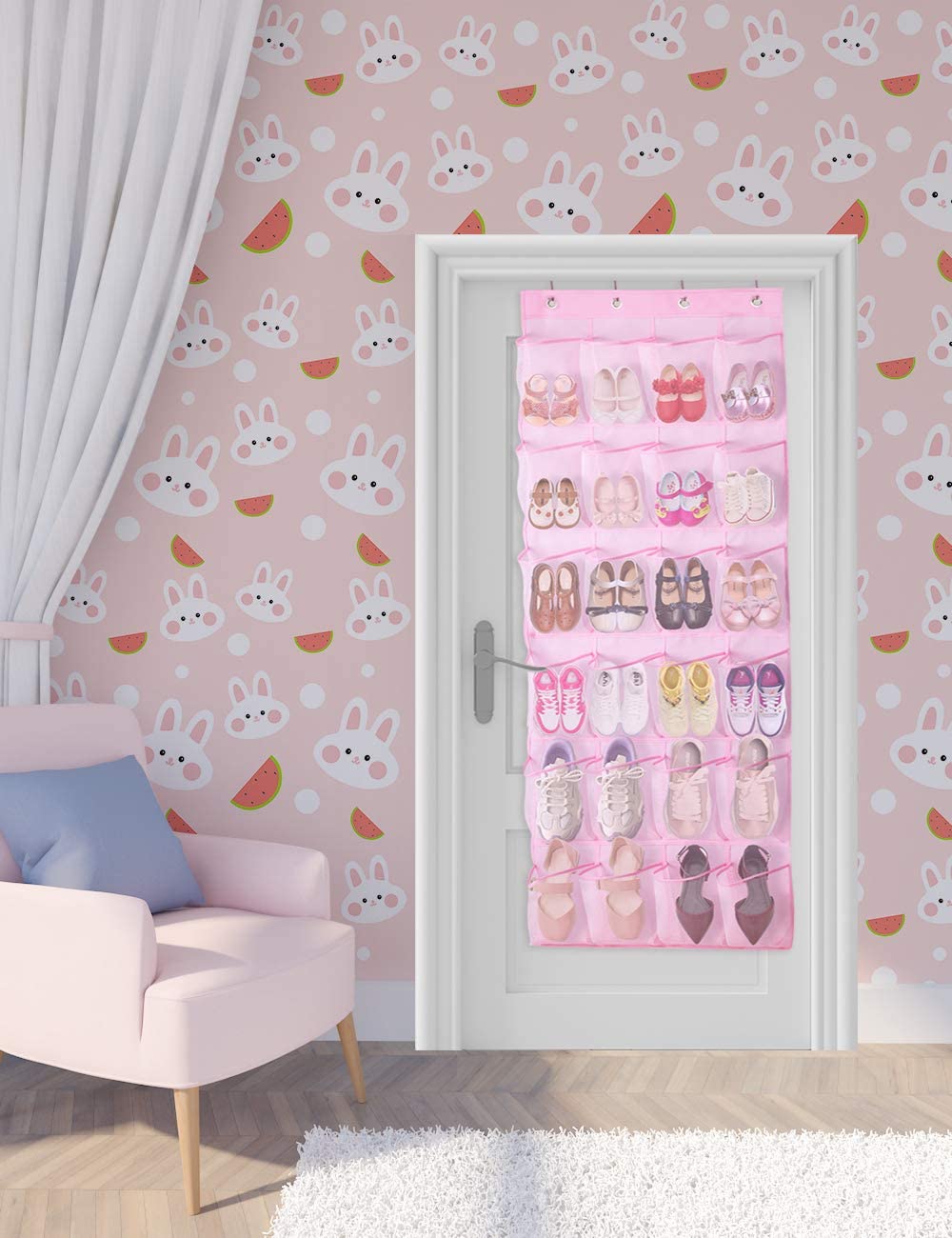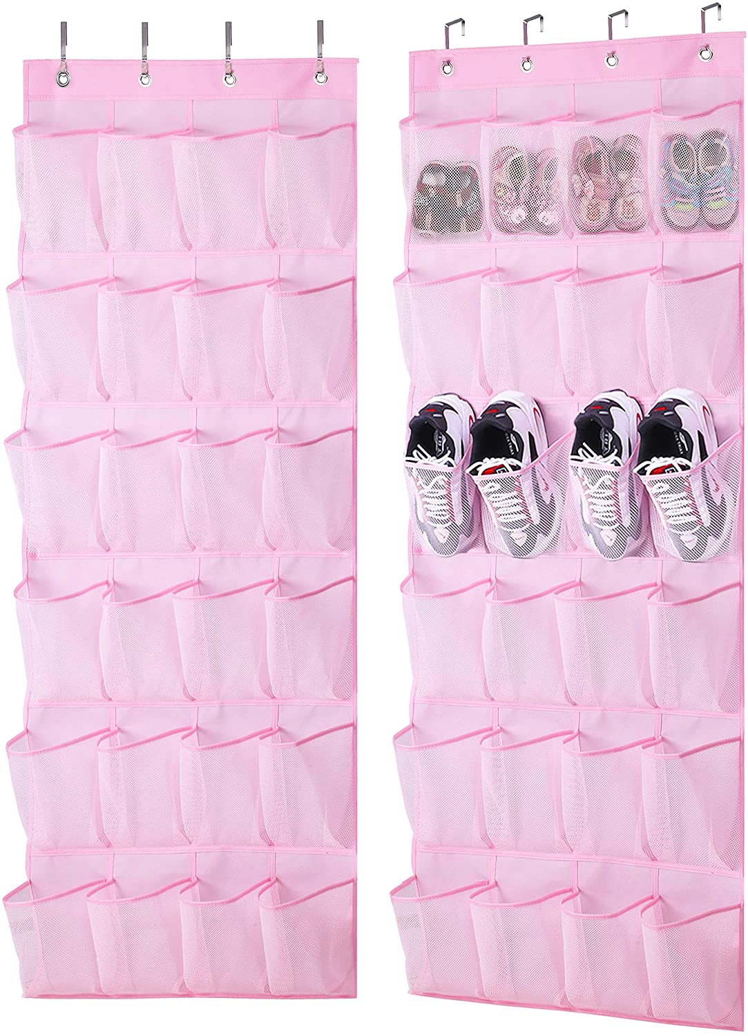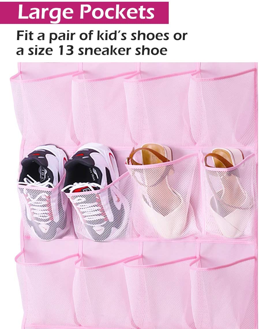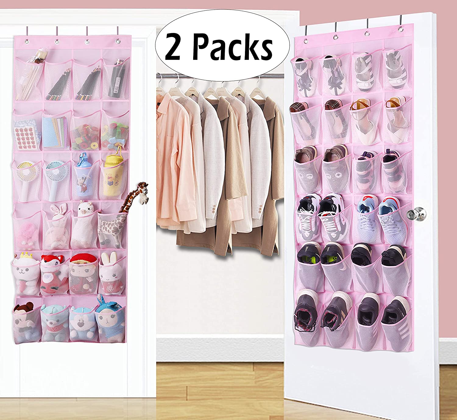 2 Pack back of door storage organizer: Each one has 24 large pockets fit children's shoes, stuffed animals, barbie dolls and more with the hanging pink pocket organizer, totally comes with 8 metal over the door hooks, fit standard door (thickness between 1.37" to 1.65");