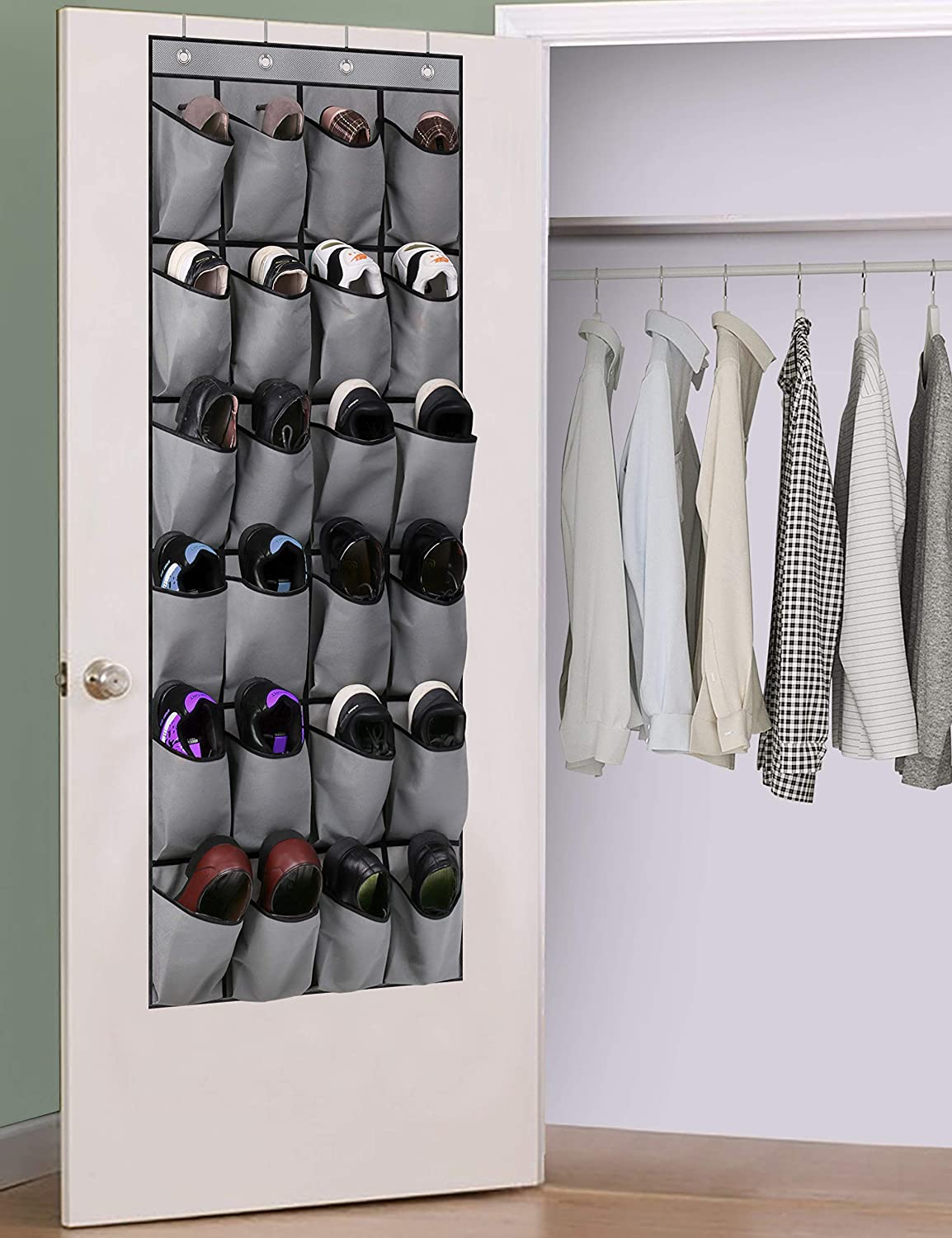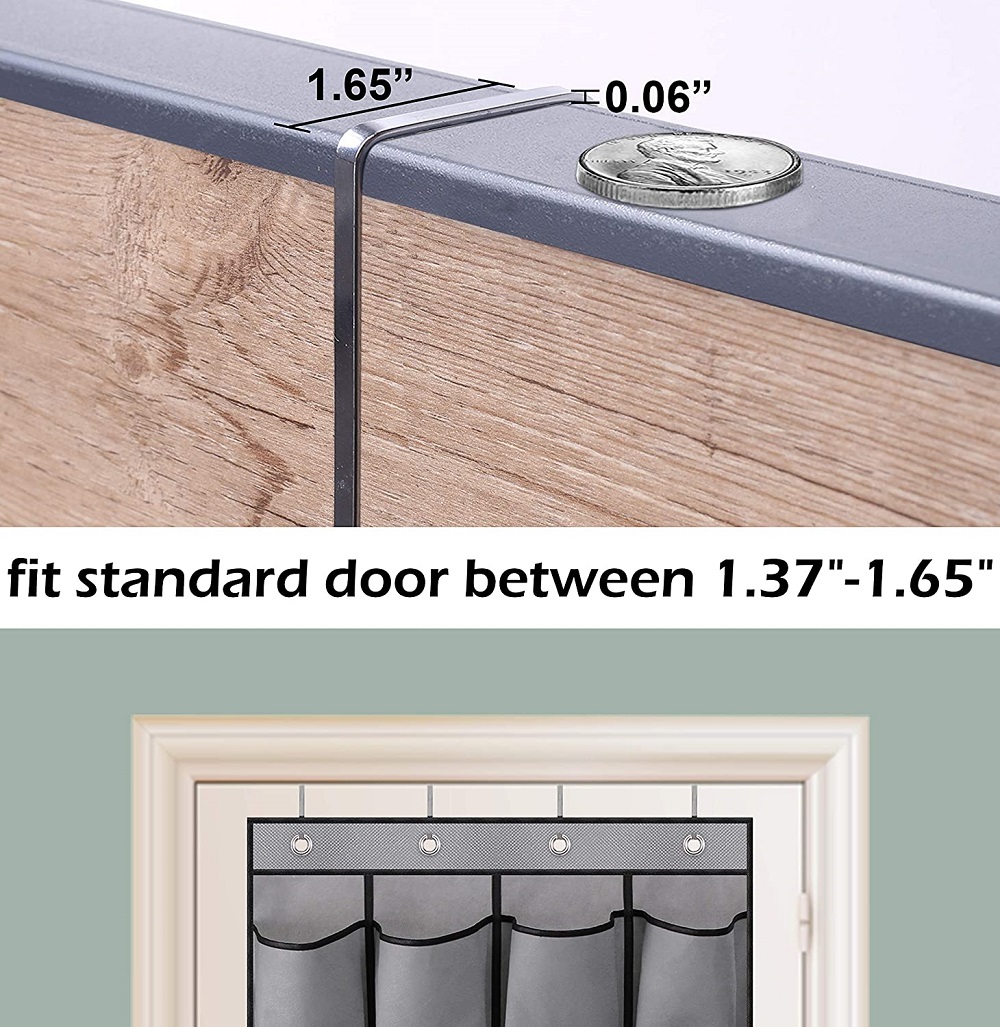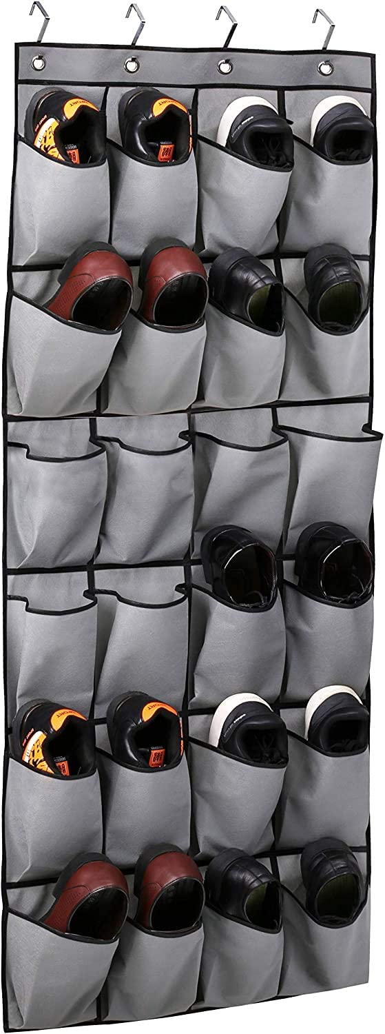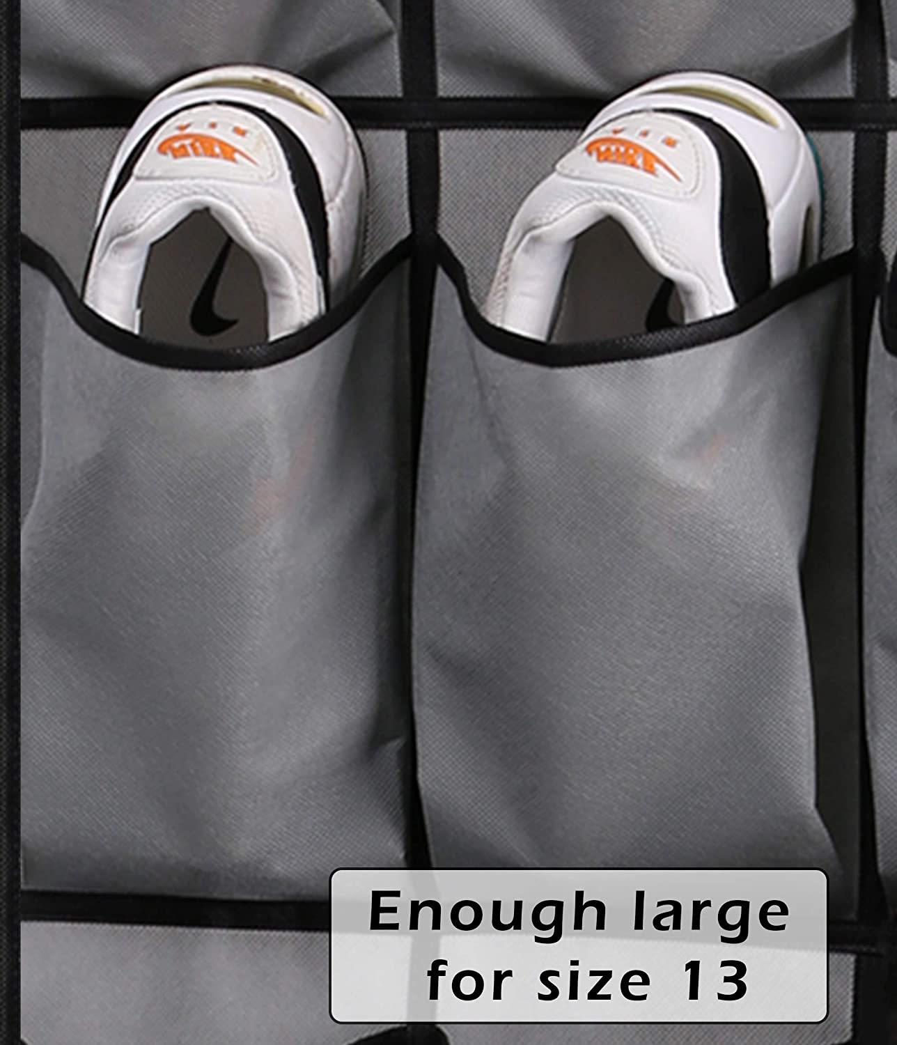 Behind door shoe holder: 24 large pockets big enough to fit 12 pair of men's shoes, totally come with 4 metal over the door hooks, fit standard door (thickness between 1.37" to 1.65");