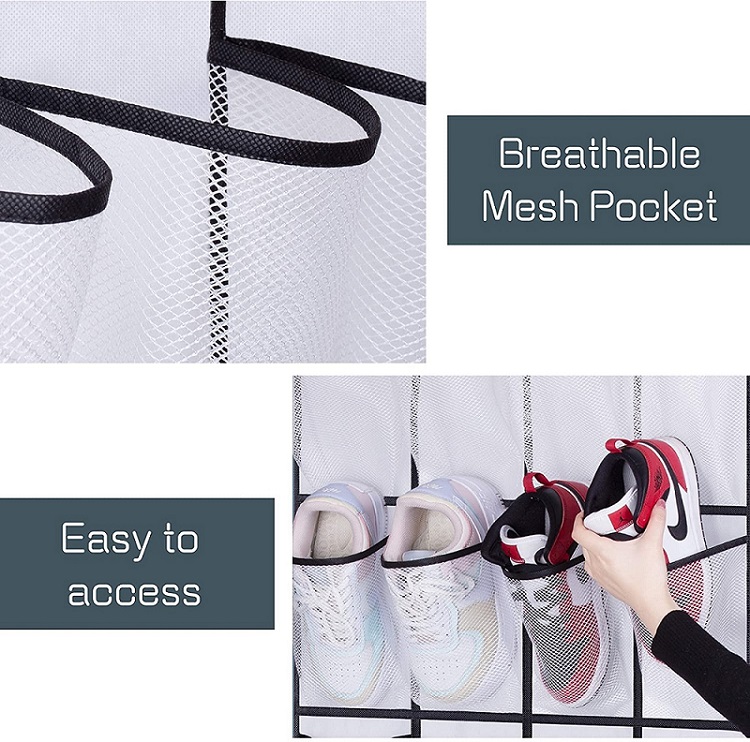 【Sturdy Material】: Breathable extra strong non-woven material keeps the structure rigid, clear mesh large pocket allow for easy viewing of the contents within, back of door shoe holder promote airflow through the pockets keeping shoes fresh;