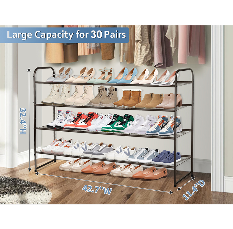 【Longer shoe rack for 30 Pairs】 Size of Large capacity shoe rack: 42.7''W x 11.4''D x 32.4''H, can hold 30 pairs of shoes for men, women and kids in total, each tier wide enough storage for 6 pairs of men's sneakers or women's flats, extra bottom storage for slippers or flip flops enough. Shoe rack for closet enough to meet the use of a family and let the home more clean and tidy;