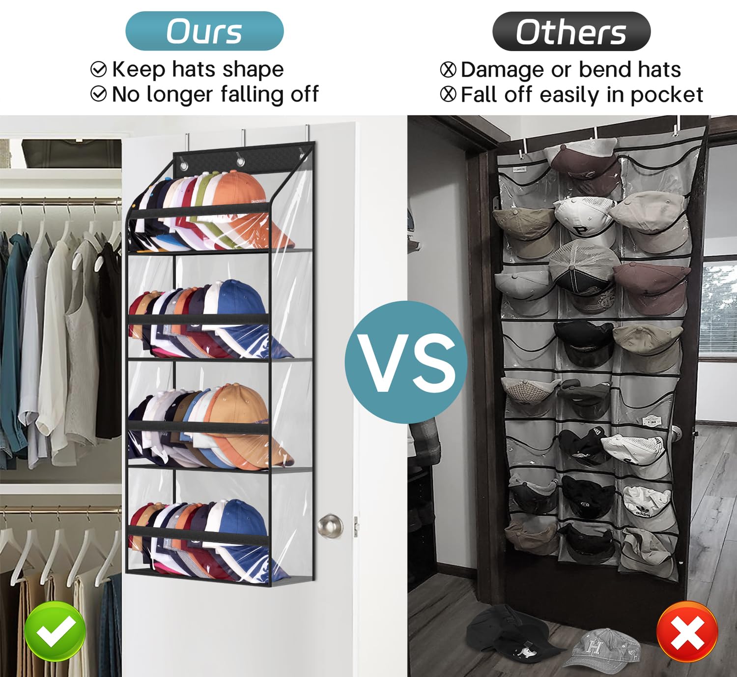 【Multi-Purpose】: Hat organizer for closet, door or wall is not only a better organization of baseball caps, but also a good storage for toys, purses, snacks, socks, scarves, gloves, yarn, accessories, bottles, cleaning supplies, clothes, towels, make up and any other household items as you wish.