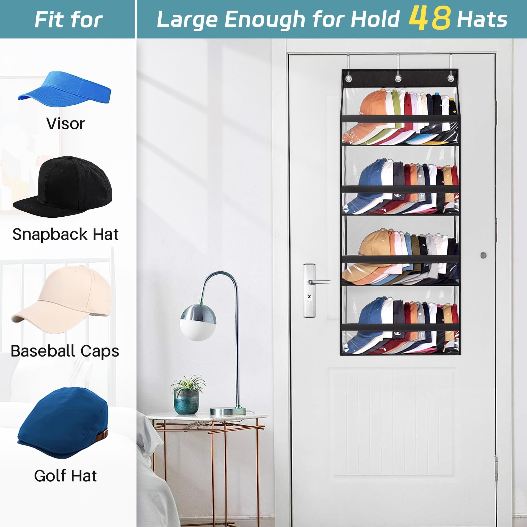 【Store up to 48 Hats】: Overall size of hat rack for door: 16.7" W x 7" D x 36.2" H, height per layer is 9.1" H, Each layer is wide&deep enough to hold 10-12 snapback caps, so cap rack can store up to 48pcs hats in total, fit for flat bills hat, jelly hats, fitted cap, trucker cap, golf hat, sun hat, ball cap, visors, mini cap or other caps;