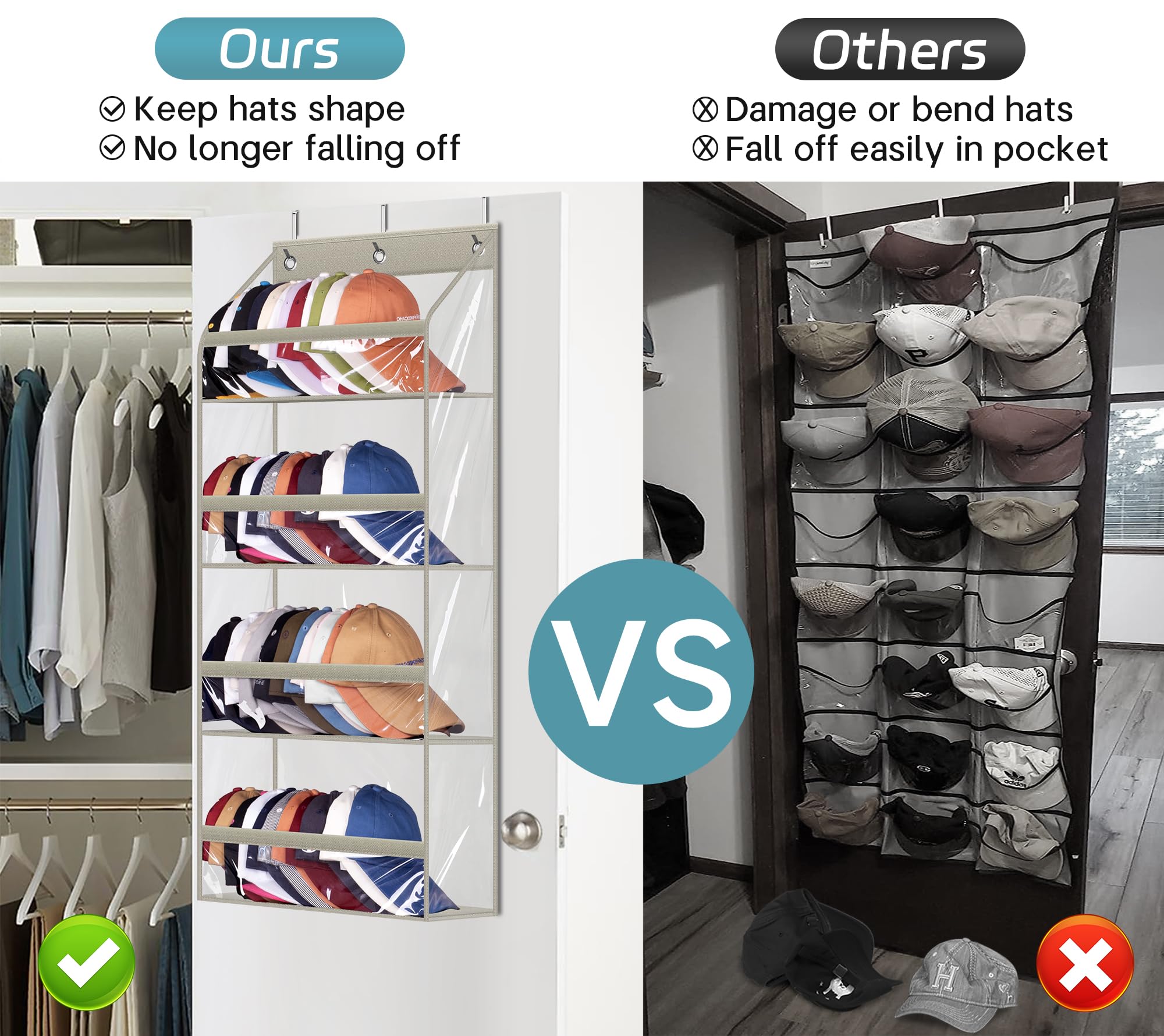 【Multi-Purpose】: Hat organizer for closet, door or wall is not only a better organization of baseball caps, but also a good storage for toys, purses, snacks, socks, scarves, gloves, yarn, accessories, bottles, cleaning supplies, clothes, towels, make up and any other household items as you wish.