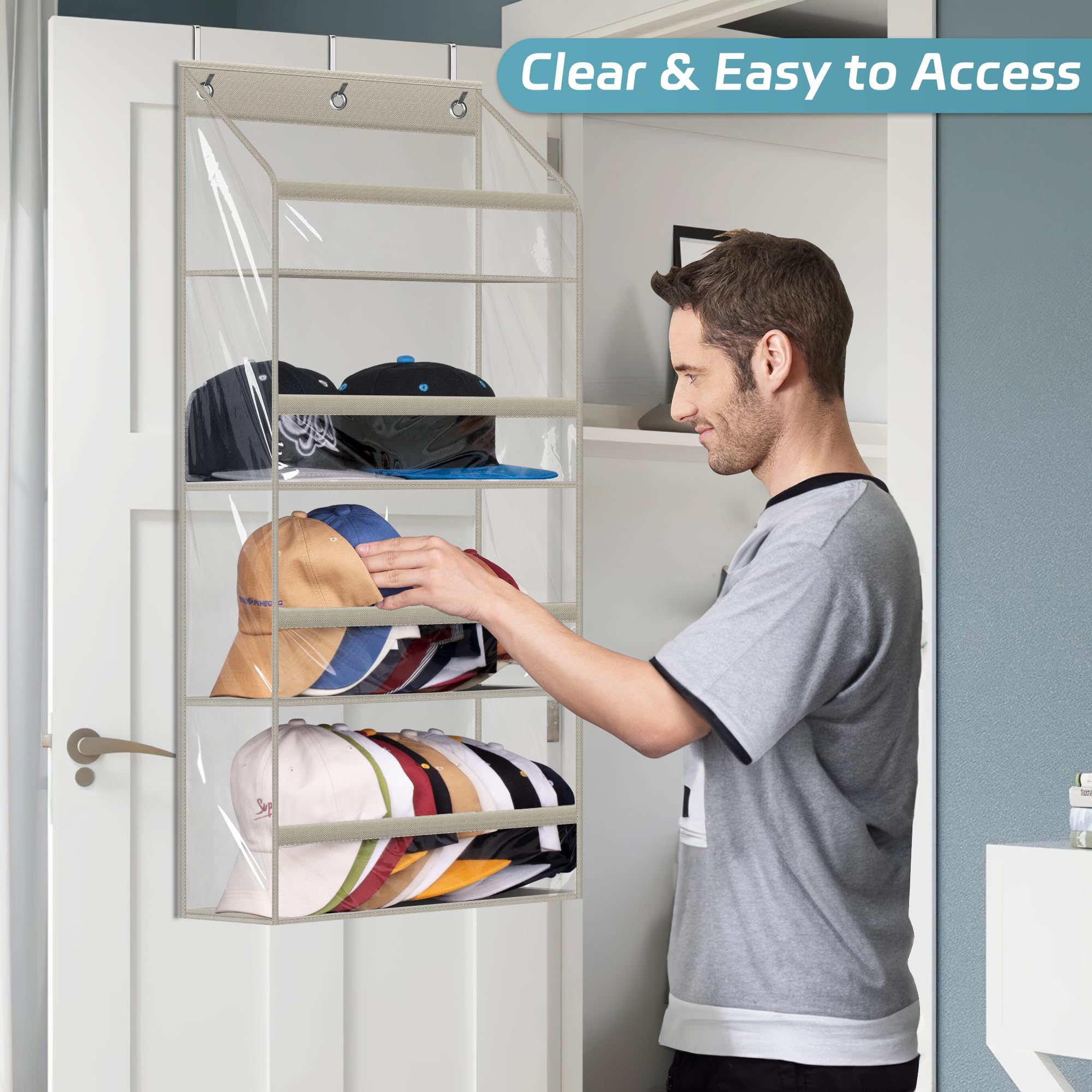 【Easy to Access】: Clear PVC & the special open design is convenient for you take form the deep pouches without rummaging through boxes, besides, fully transparent design make baseball hat organizer a unique hat display stand, especially for hat collecting fanatics, you can fully display your valuable hat collection. If the surface gets dirty, simply clean it with a soft brush or wet cloth;