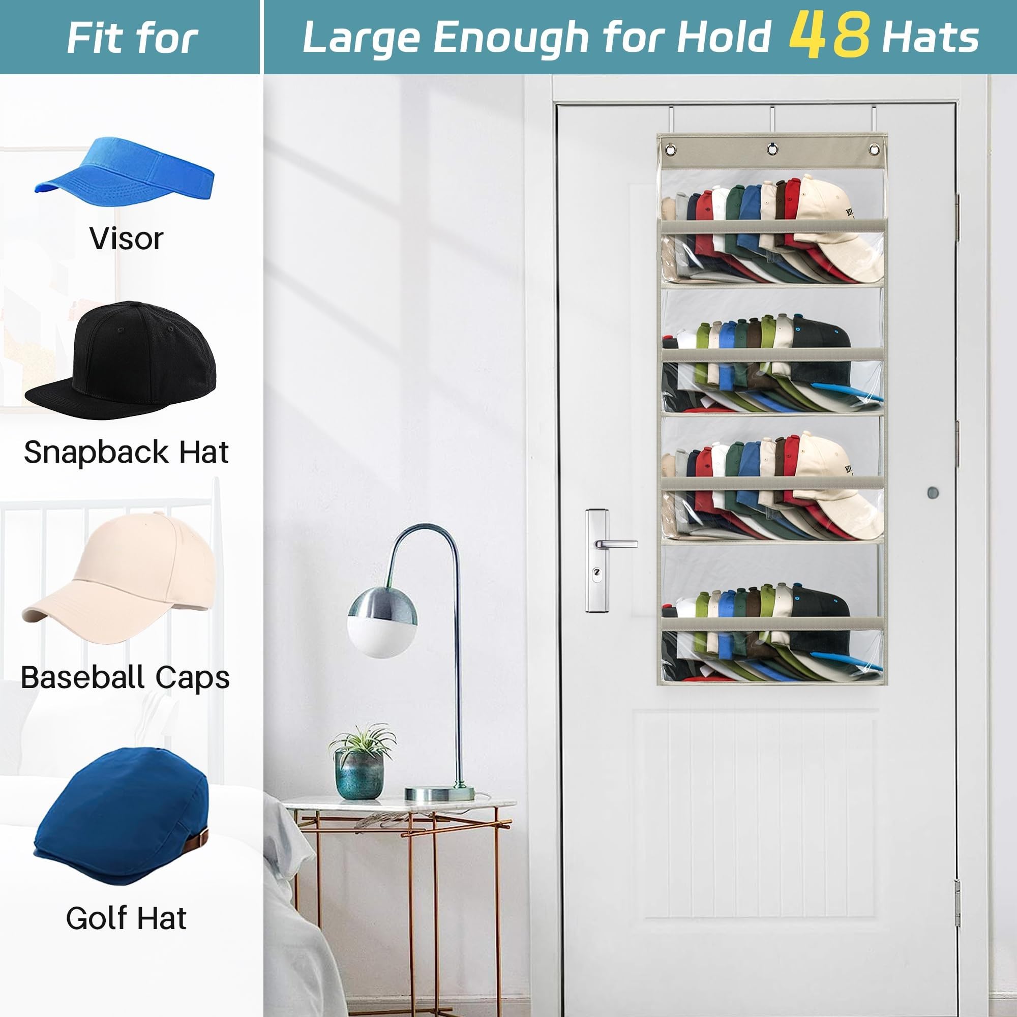 【Store up to 48 Hats】: Overall size of hat rack for door: 16.7" W x 7" D x 36.2" H, height per layer is 9.1" H, Each layer is wide&deep enough to hold 10-12 snapback caps, so cap rack can store up to 48pcs hats in total, fit for flat bills hat, jelly hats, fitted cap, trucker cap, golf hat, sun hat, ball cap, visors, mini cap or other caps;