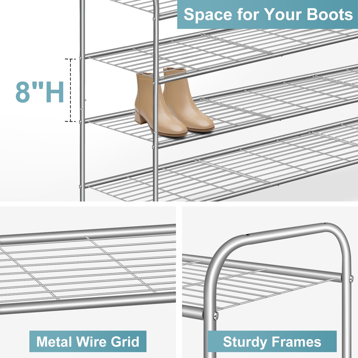 【Longer Shoe Rack for 30 Pairs】 Size of metal shoe rack: 42.7"Wx11.4"D x32.4"H. Longer 4 tier shoe organizer for closet can store 30 pairs of shoes for men, women and kids, each tier wide enough storage for 6 pairs of men's sneakers, tennis shoes etc, extra bottom storage for flats, slippers and flip flops enough;