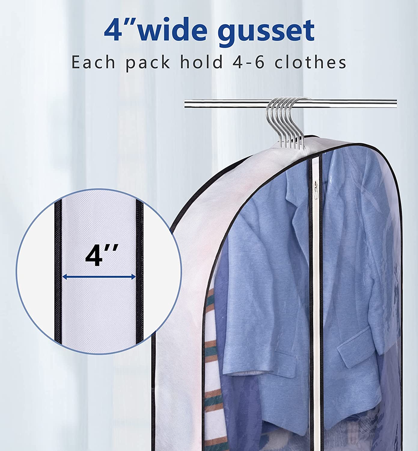 【4" Gussest】Each garment cover can store 6-8pcs of shirts or jackets with 4" gusses, which are wider than standard bags, suitable for men, women and children, every pack roomy enough to hold 6pcs short sweater or 2pcs winter coat of normal thickness;