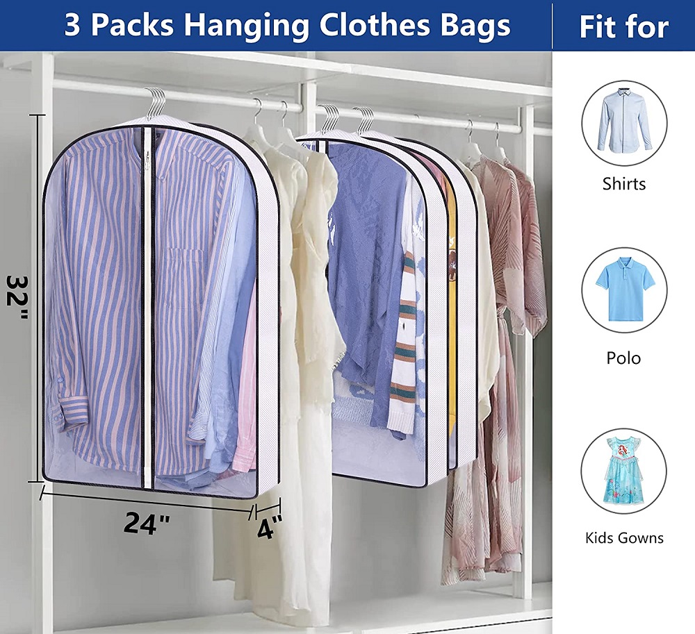 【Large Capacity】: Set of 3 packs suit cover, large capacity size :24" x 32" x 4", garment bags for closet storage are perfect for store about 24pcs short tops such as children's clothes and T-shirt;