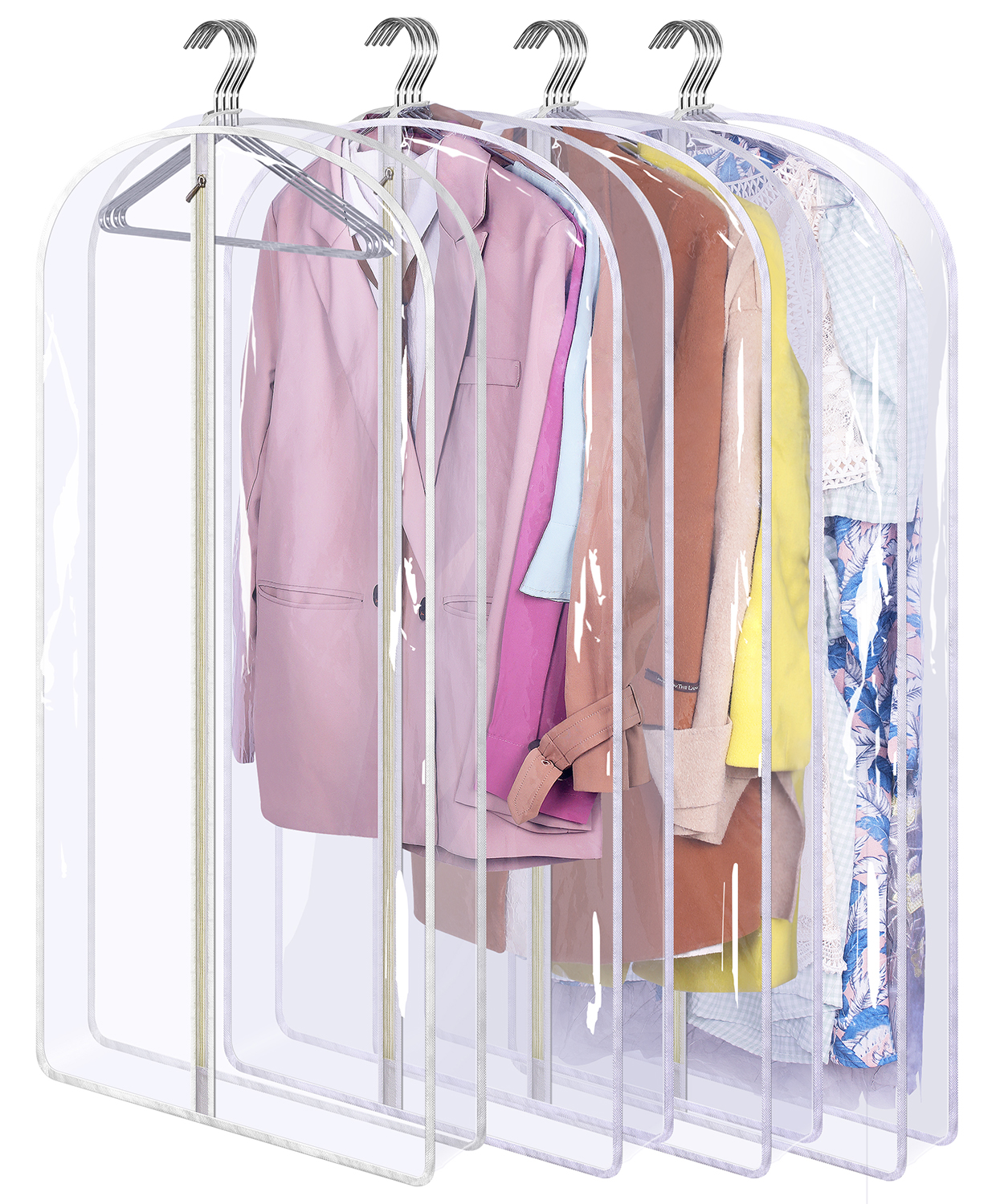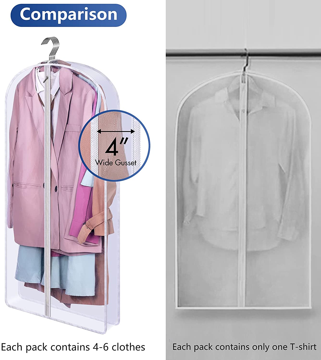 【4" Gusseted】Each garment cover can store 6pcs of suits or coats with 4" gussets, garment bags for closet storage are wider than other plastic bags, every pack roomy enough to hold 6-8 pcs shirts or 2pcs winter coat of normal thickness;