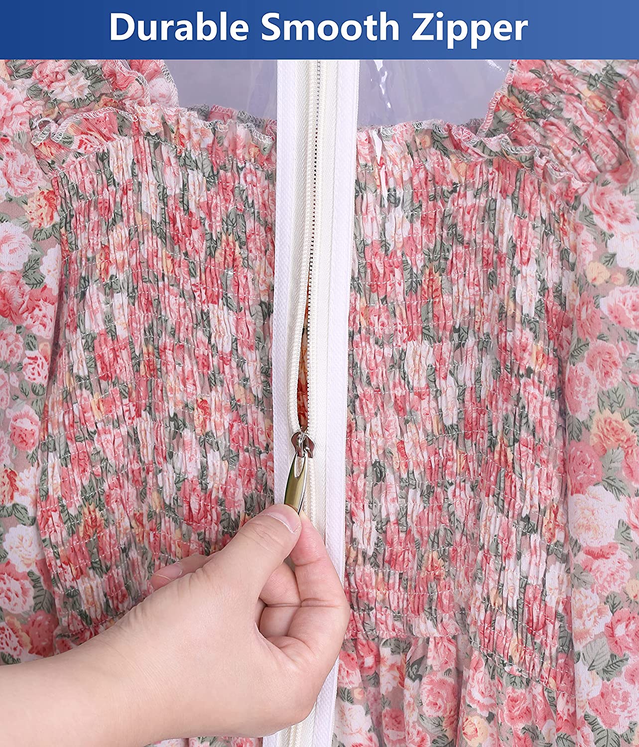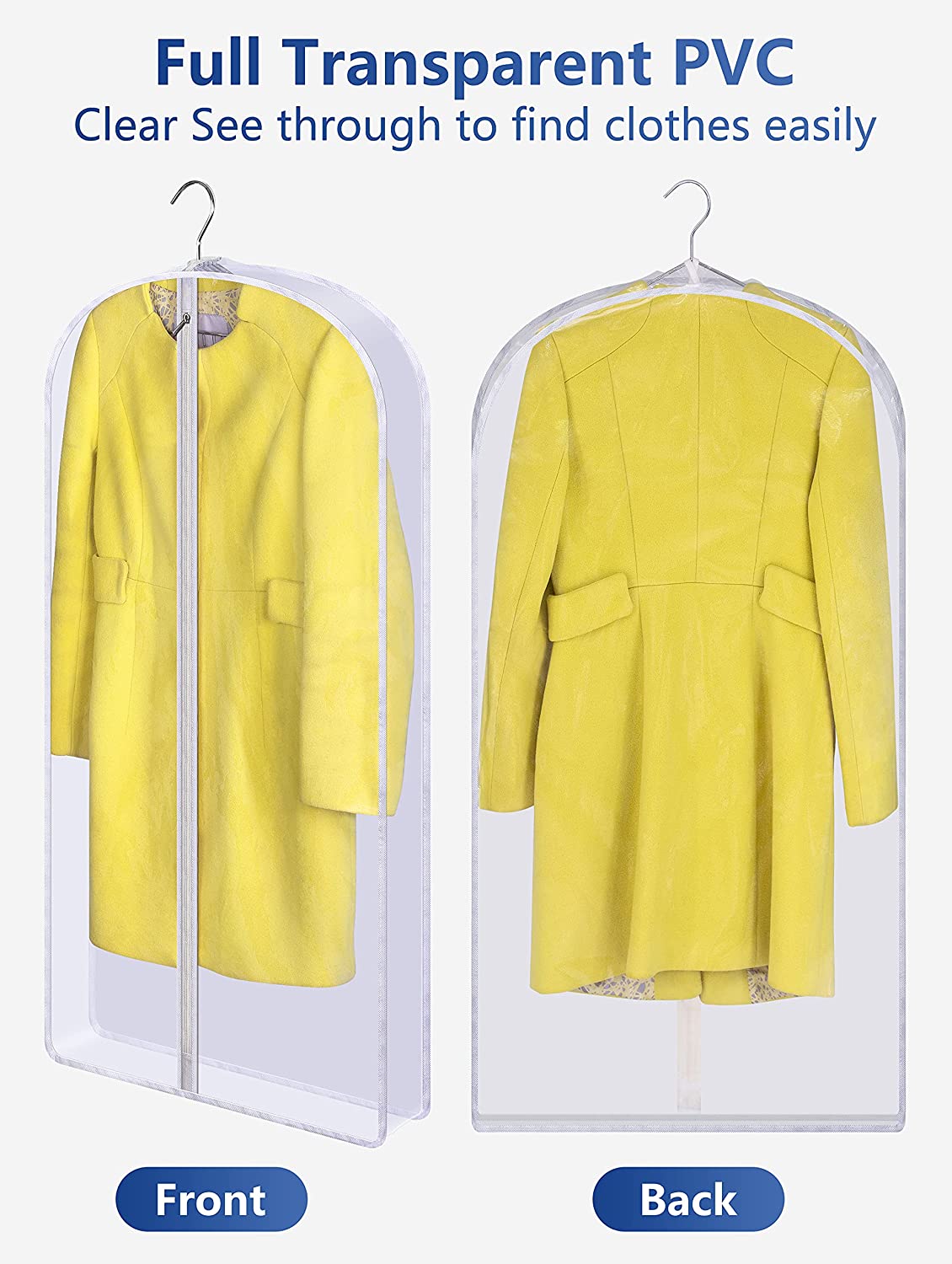 【Full Transparent Design】: Clear plastic garment bags to see what's inside quickly, hanging garment bags are fast to find the clothes what you want to wear, there is no frame in the bag that makes it easy to fold and take it for the travel, easy to clean with damp cloth or washer;