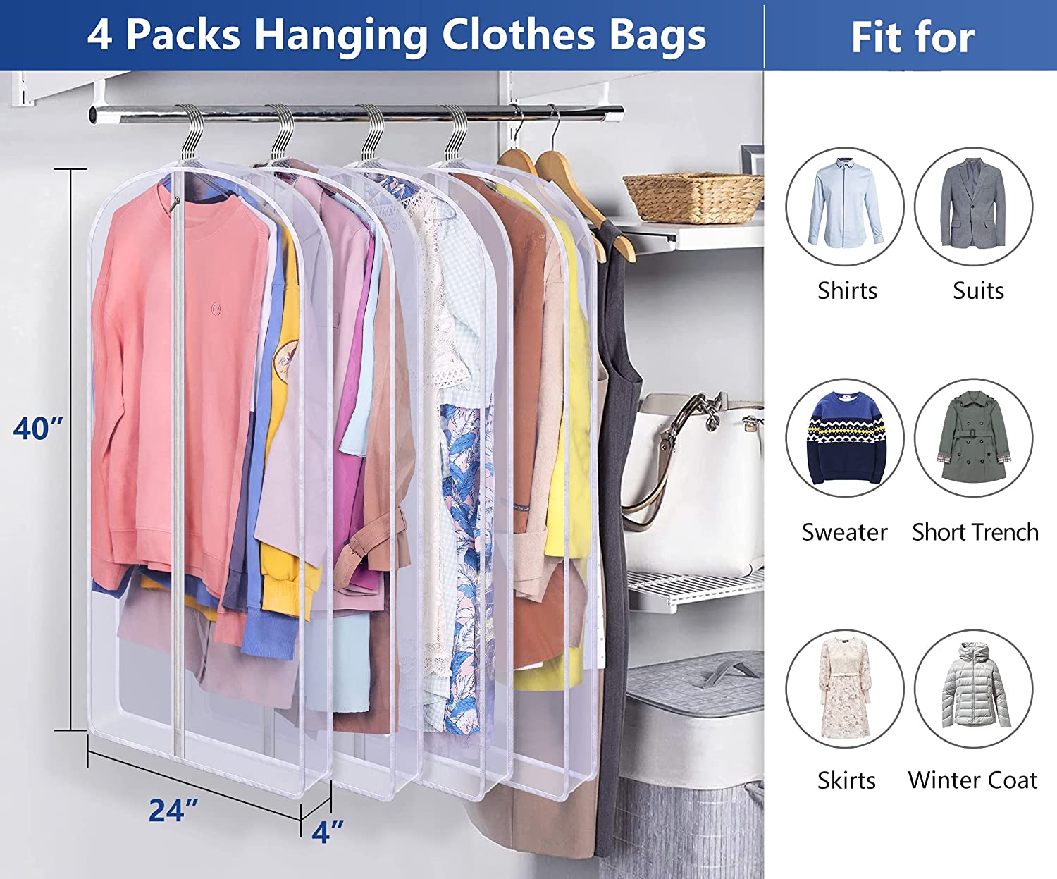 【Garment Bags Storage】: Set of 4 packs hanging clothes bags, large capacity size :24" x 40" x 4" , suit covers are perfect for store about 32 medium size clothes storage needs in total;