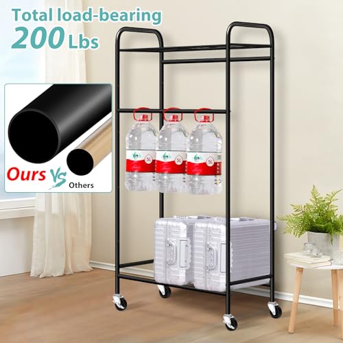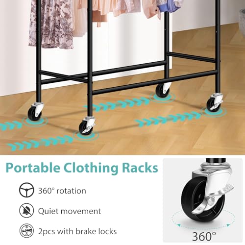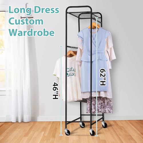 【Massive Capacity with Double Rod】: Overall size of rolling clothes rack: 15.5"D x 33"W x 75"H, large & tall enough for hold 45 dresses or 30 trench coats without wrinkling, there are high and low hanging poles, according to the needs to store women's gowns, jackets, jeans, men's suits or other shorter children's clothes inside easily, enjoy more closet space;