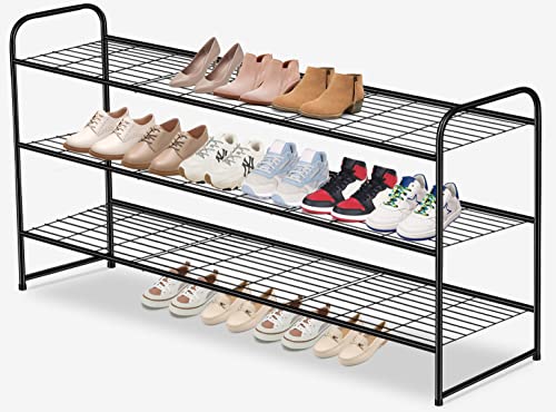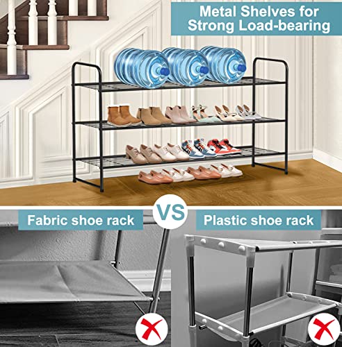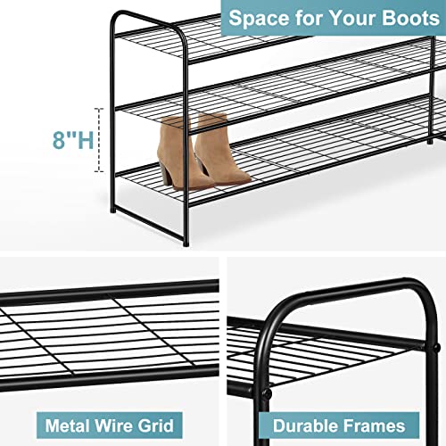 【Long Shoe Rack for 24 Pairs of Shoes】 Size of metal shoe rack: 42.7"Wx11.4"D x24.4"H. Longer 3 tier shoe organizer for closet can store 24 pairs of shoes for men, women and kids, each tier wide enough storage for 6 pairs of men's sneakers, tennis shoes etc, extra bottom storage for flats, slippers and flip flops enough;