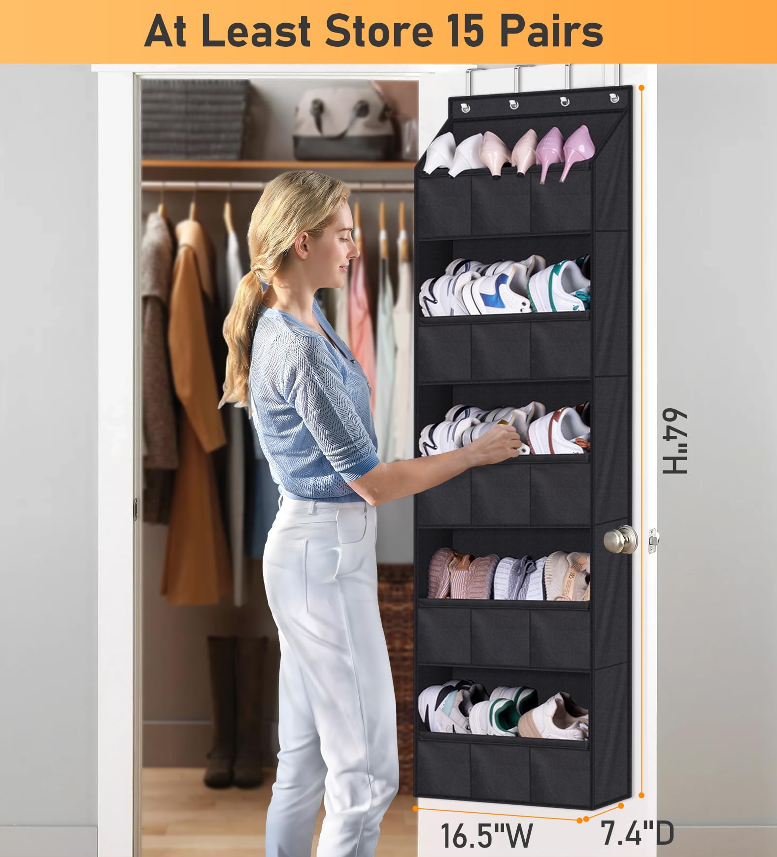 【Holds up to 15 Pairs】: Overall size of over the door shoe rack: 16.5" W x 7.4" D x 64" H, shoe organizer can hold 15 pairs of shoes at least, such as tennis shoes, sneakers, high heels, or 30 pairs of flip flops, sandals, kids shoes etc;
