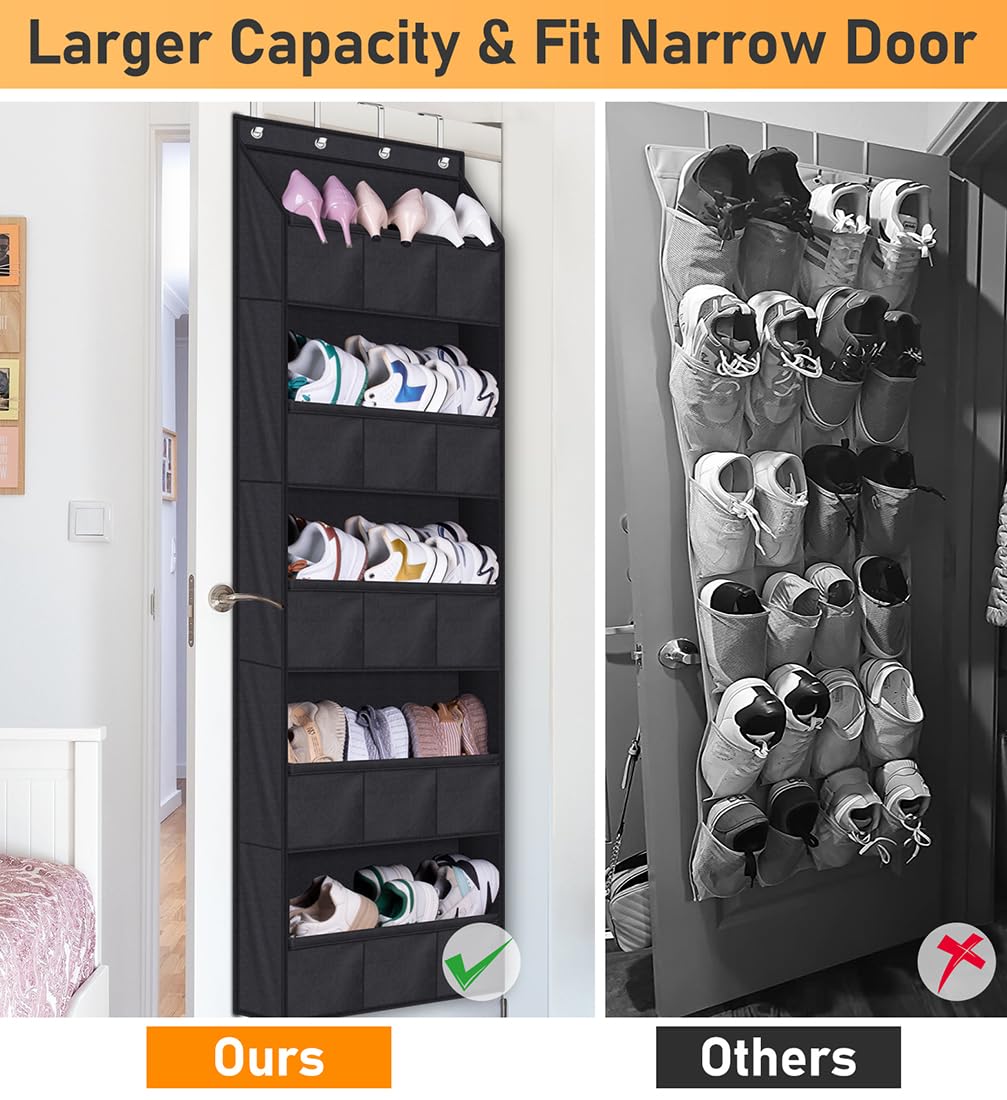 【No Falling Off or Saggy】: AOODA shoe rack over the door is durable and isn't saggy or flappy like some mesh pocket shoe storage can be, it with cardboard at the bottom of each layer and fiberglass strips at the front fence, shoes don't fall out easily and can keep shape for a long time;
