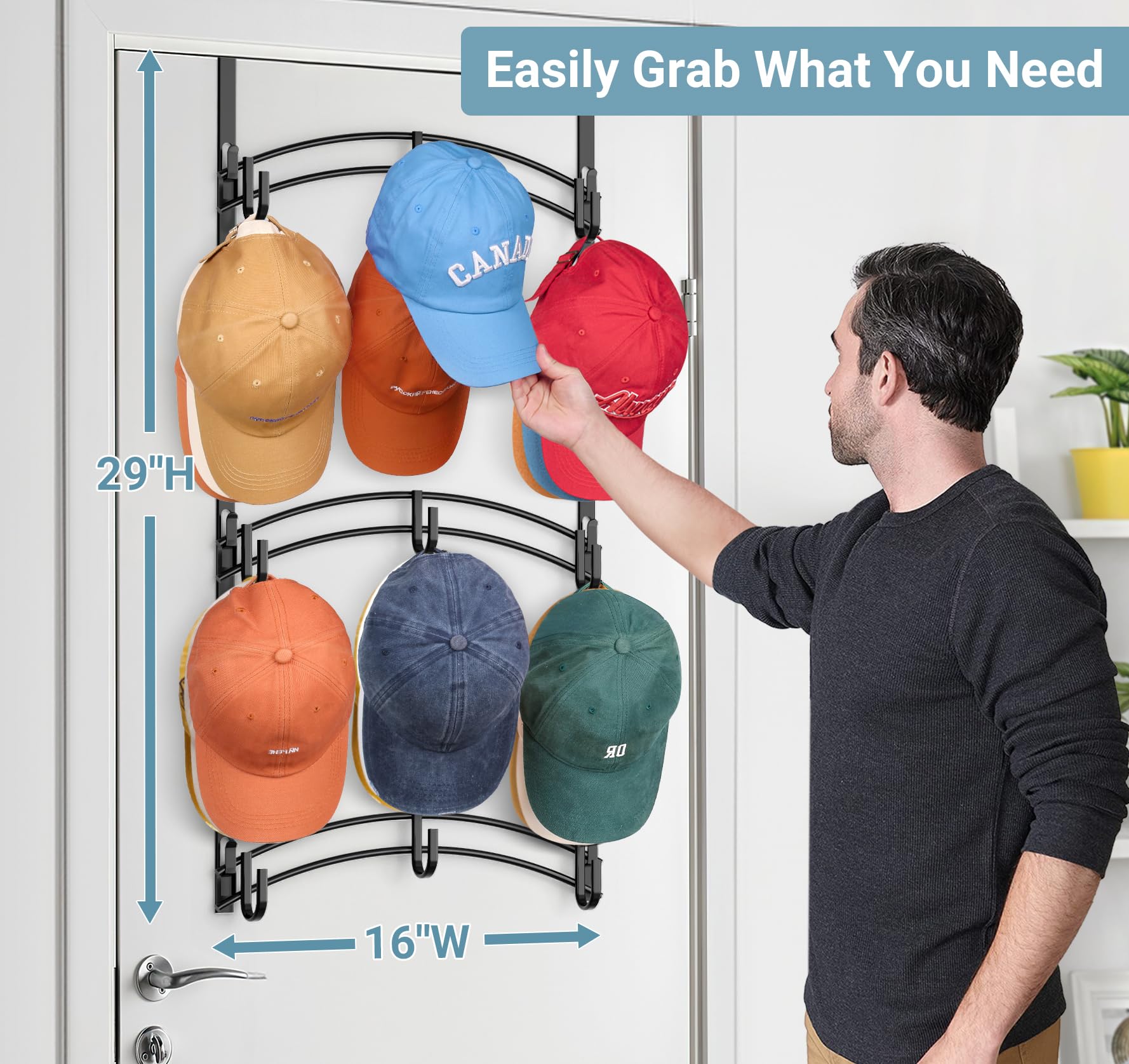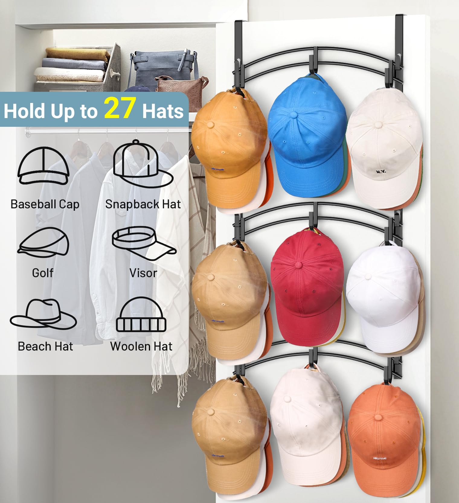 【Large for 27 Caps】3-Tier hat organizer for baseball caps with 9 hooks, each capable of holding 2-3 hats, the hat hooks for door can store up to 27 hats, suitable for fitted caps, trucker caps, golf hats, sun hats, ball caps, visors, etc, keeping your hats neat and organized;