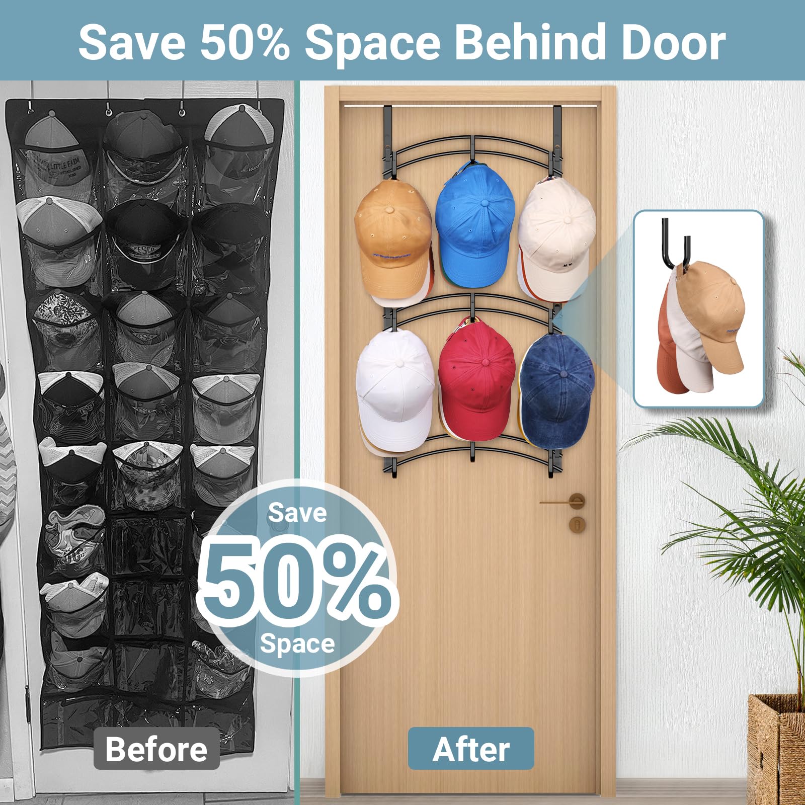 【Save up to 50% of Space Behind Doors】Overall size of the hat rack: 16"W x 29"H, the compact design of the door hat organizer efficiently utilizes vertical space, saving up to 50% on-door space than the standard baseball hat storage organizer, fit for closet door, bedroom and dorm door as thick as 1.42 "-1.77";